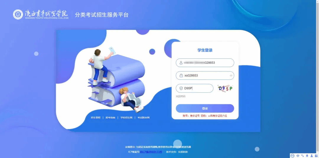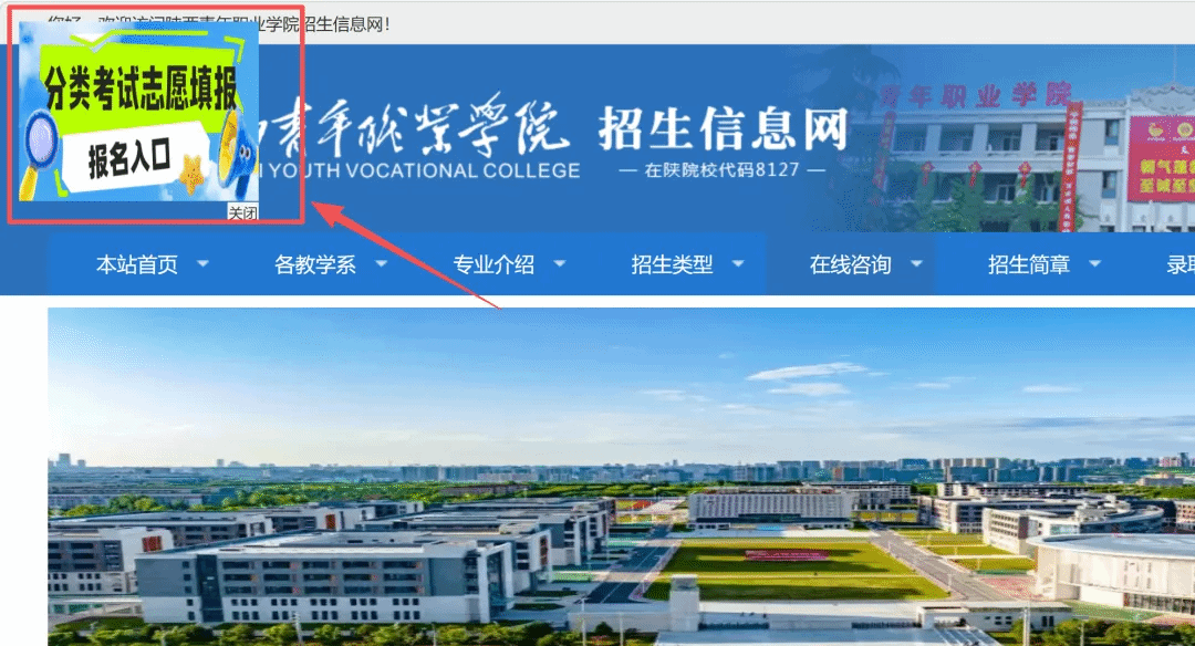 或登录陕西青年职业学院招生信息网(https://zsw.sxqzy.com/),点击“分类考试志愿填报报名入口”,进行操作。