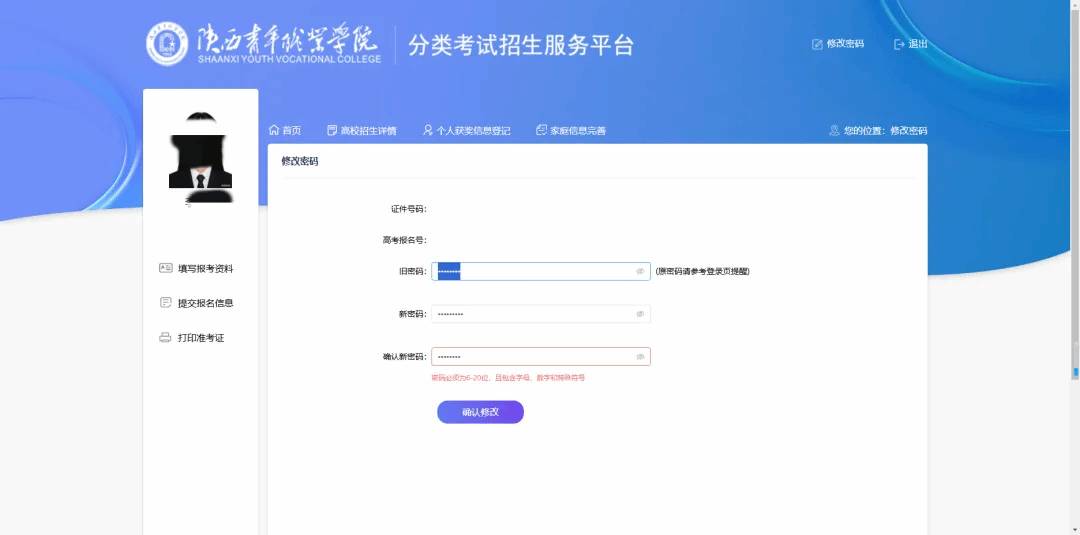 第三步:登录成功后请核对照片、身份证号与高考报名号,并修改登录密码,要求长度6-20位,且必须同时包含字母、数字和特殊符号,请牢记修改后的密码。