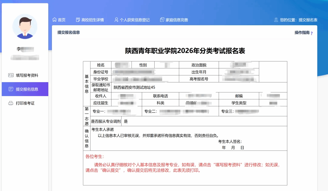 第六步:点击左侧“提交报名信息”,预览报名表,检查无误后点击“确认提交”,完成专业申报。需要修改则返回第四步。