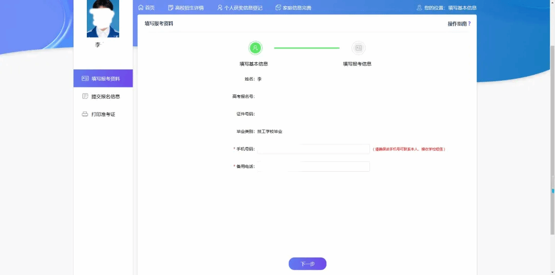 第四步:在左侧点击“填写报考资料”,填写基本信息,确认无误后点击页面下方“下一步”。
